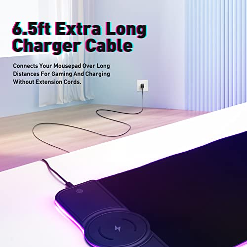 【Fantastic RGB Colors】: The RGB mousepad’s size is XXL mouse pad features 7 static light modes and 2 dynamic light modes; you can select your favorite color according to your needs. One button controls light modes. The colorful lights provide visually vibrant colors and gorgeous effects. It’s the best wireless charging mouse pad and office mat for your desktop. A must device for rgb mouse pad fans. Perfect for your gaming or working.