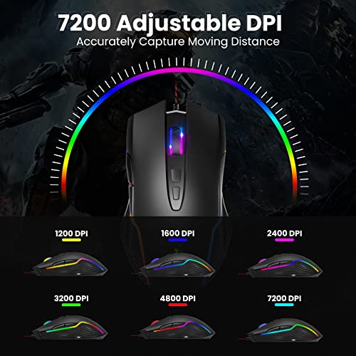 【Sensitive Optical Sensor】This gaming mouse has 6 levels of DPI to choose from, up to 7200 DPI (1200-1600-2400-3600-4800-7200 DPI). It matches you perfectly in different games and meets all the needs of gaming, video, office and home. Even small movements are easily captured by the optical sensor inside the mouse and reflected on the device.