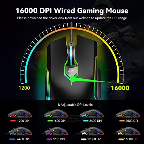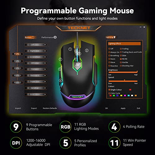 TECKNET RGB Wired Gaming Mouse with 11 Backlit Modes, 8-Level 16,000 DPI Adjustable, PC Gaming Mice with 9 Programmable Buttons, Ergonomic LED Backlit Computer USB Mouse for Laptop/PC/Windows/Gamer