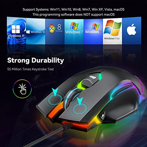 【Customizable RGB Wired Gaming Mouse】16.8 Million RGB colors and 11 lighting modes for easily switching and customizing backlit effects, giving your amazing gaming atmosphere and immersive gaming experience.