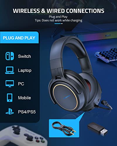 Wireless Gaming Headset PS5 PS4 – Wireless Headset for Computer,5.8GHz,Over Ear Headphones Noise-canceling mic,3D Surround Sound, 3.5mm Jack Wired Mode for Xbox,Laptop Mac Nintendo NES Games
